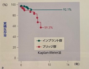 観察期間中に補綴装置の喪失があった場合に非生存とする」8年累計生存率はインプラント群が有意に高かった